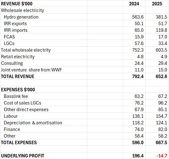 Once the table of revenue and expenses is presented the structure of Hydro’s underlying profit becomes unmistakable. The top half of the table shows where Hydro’s money actually comes from: the electricity it generates, the IRRevenues it earns when power flows across Basslink, the LGCs it sells, the FCAS services it provides, and the smaller contributions from consulting, some minor retail operations details of which are yet to be disclosed, and its joint venture interest.