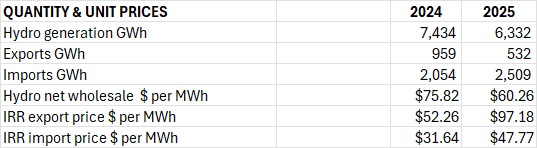 The fall is not evenly spread. Generation revenue alone fell by more than $180 million, from $563.6 million to $381.5 million, reflecting the simple reality that Hydro had less water and fewer opportunities to generate. Hydro generation fell by 1,202 GWh to an historic low of 6,332 GWh. Not only that but prices crashed also, to $60 per MWh. This is the average wholesale price achieved by Hydro for the year. IRRevenue, by contrast, rose sharply – imports and exports together delivered $171 million in 2024/25, compared with $115 million the year before. These figures are based on public figures for gross IRRevenues less an estimate for transmission losses. The increase in IRRevenues cushioned the blow but could not offset the collapse in generation revenue or the structural losses emerging in LGCs, where revenue fell from $57.6 million to $33.4 million as certificate prices halved.