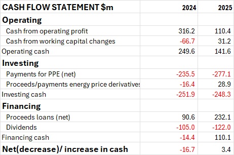 The third element in the table – and the one that often causes confusion – is the line showing proceeds and payments from energy price derivatives. These are real cash movements, not accounting entries. They arise when Hydro closes out or adjusts hedge positions early, either to lock in a gain, cut a loss, or respond to hedge positions not required due to changed circumstances. It’s impossible to know for sure. In 2023/24, Hydro paid $16 million to exit unfavourable positions. In 2024/25, it received $29 million from closing out profitable ones. These movements reflect Hydro’s risk management decisions in a volatile market. They are not the cause of Hydro’s financial stress, but they do reveal the pressures the business was under.